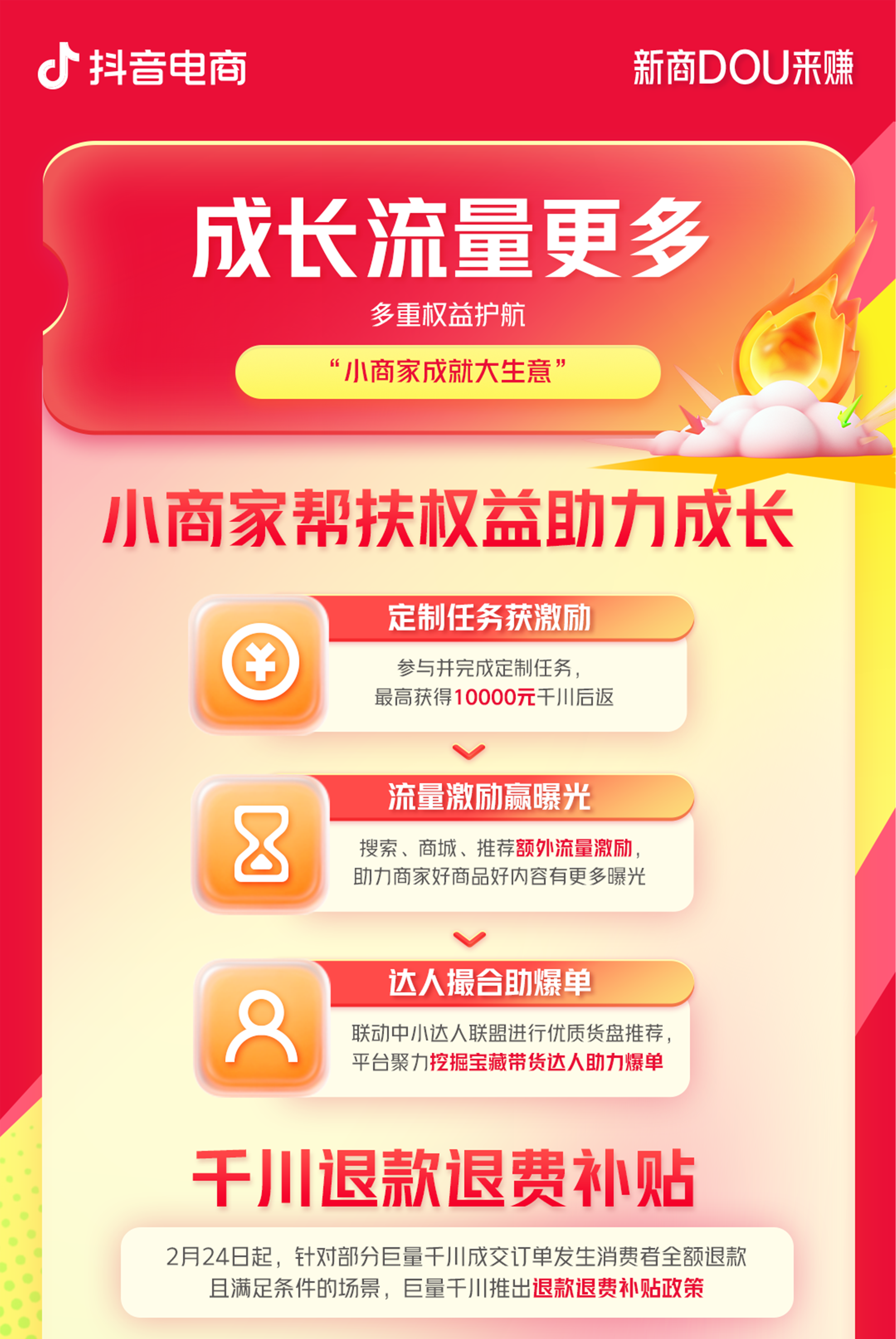 更多流量成就更多销量,为了让新商家在开店前期就能收获更多流量从而先人一步,【新商DOU来赚】推出“小商家帮扶权益”助力成长,参与并完成定制任务最高获得10,000元千川后返,还有流量激励、达人撮合等优质扶持,助力商家的商品获得更多曝光,实现生意增长。2月24日上线的千川退款退费补贴政策,进一步帮助新商家减少因退款而产生的经营损失,保障长期且稳定的生意发展。