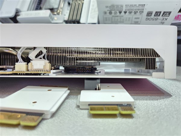 其实在背插3.0方案中,为了隐藏供电走线,就单独设计了一种名为GC-HPWR的转接卡,取消传统供电接口,改为在显卡PCIe金手指旁、主板PCIe插槽末端,各设置一个供电接口,用转接卡连接它们,实现供电。