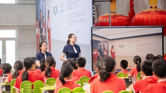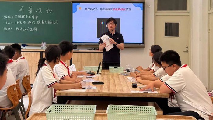 课程围绕 “设计美好‘屏’生活” 和 “屏幕探秘・流水线生产像素点模拟器” 两大主题展开:前者旨在带领学生感受屏幕科技魅力,激发创意设想;后者通过模拟流水线作业,让学生在团队协作中体验工业劳动流程,提升实践能力。