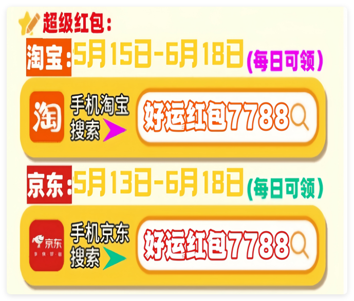首先,划重点!今年天猫/淘宝和京东的618红包口令都是「好运红包7788」要记住!领的红包大小和你搜索的什么口令有关的!这个双平台通用口令包领到大的!记得每天去领!