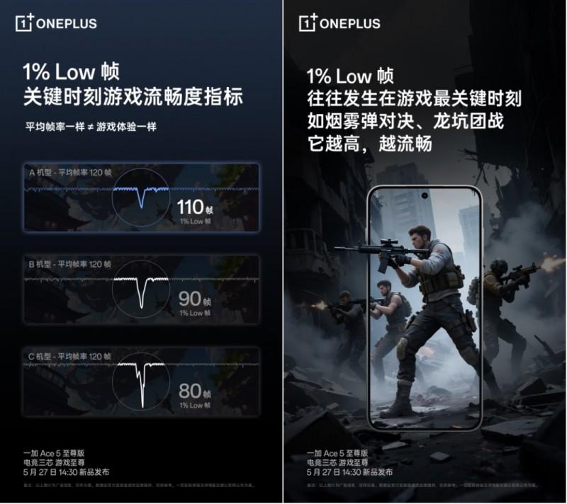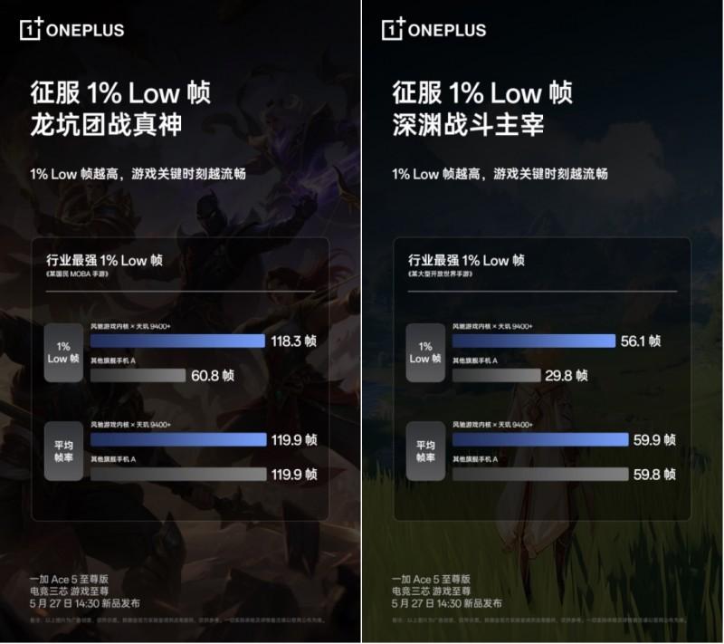 一加 Ace 5 至尊版搭载了集天玑旗舰芯 9400 +、灵犀触控芯、电竞 Wi - Fi 芯 G1 于一体的「电竞三芯」全链路硬件级游戏解决方案,还融入了一加自研的「风驰游戏内核」技术,带来持久满帧的游戏体验。在满帧体验之上,为解决"平均帧率接近满帧但游戏仍卡顿"的手游体验痛点,一加还将PC级游戏评测标准1% Low帧纳入手机游戏体验的衡量标准中。1%Low帧指的是把一段游戏的帧数从高到低排序,取到最低的1%帧的帧率平均值,这些瞬间往往发生在游戏最关键的时刻,对游戏流畅体验影响巨大。1%Low帧越高,代表游戏体验越流畅。在天玑9400+旗舰芯片和风驰游戏内核的加持下,一加 Ace5至尊版在《王者荣耀》、《原神》、《崩坏:星穹铁道》、《和平精英》等热门手机游戏中,不仅做到了平均帧率最高,更能实现“行业最强的1% Low帧”表现。