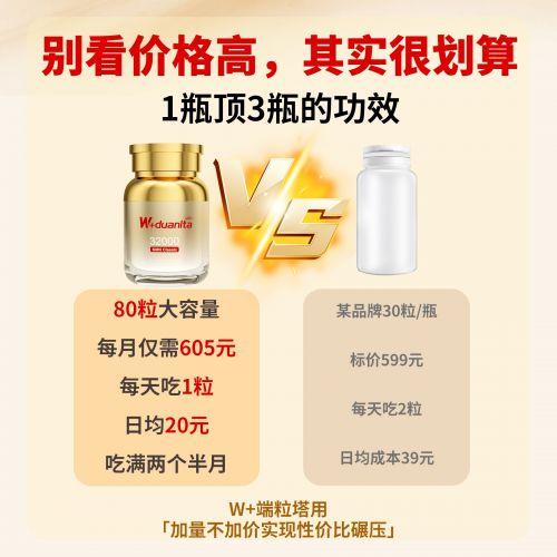 W+端粒塔总投入:605元/月/80粒×12个月=7260元,看似每月更贵,实际1天仅需1粒,1瓶80粒,吃满2个半月,令细胞年龄年轻5-8岁,同时具备改善睡眠、提高免疫力、改善疲惫等功效。