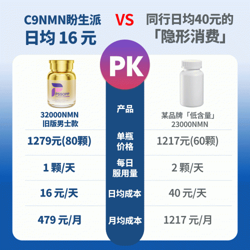 按3个月抗衰周期算C9NMN盼生派32000旧版男士款在618活动期间内3瓶8折折后价单瓶仅需1279元,某品牌需3651-5476元,选择C9NMN直接省下一台iphone16手机的钱!
