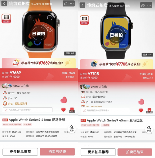 当天以1元起拍价亮相的苹果爱马仕双奢联名款产品——Apple Watch Series 9爱马仕版,同样掀起了一场激烈的竞价风暴。这款融合科技与奢侈基因的智能腕表,凭借其标志性的爱马仕手工编织H纹真皮表带和苹果的科技性能,吸引了众多高端数码收藏家和时尚达人的热烈追捧。拍卖过程中数码发烧友们轮番举牌。其中一只45mm版本腕表经历了22轮紧张刺激的出价角逐,最终以7705元的高价被一位发烧友收入囊中。一只41mm版本腕表则引发了更激烈的26轮竞价大战,最终成交价定格在7669元。