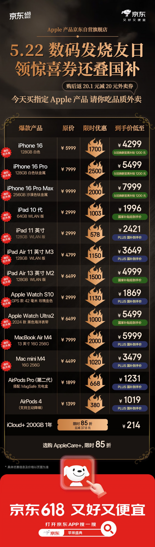 除了竞价拍卖,果粉在京东下单Apple爆品还能得20元大额外卖券。另外为让广大消费者可以低价入手Apple产品,Apple产品京东自营旗舰店还带来了iPhone 16 Pro系列至高优惠2500元、惊喜券叠加国家补贴、限时抢以旧换新1200元大额券等福利,部分产品还能额外叠加PLUS大额消费券、教育优惠,全线产品国补后低至6折还能享12期免息。iPhone 16低至4299元,iPhone 16 Pro低至5499元起,iPad Air到手低至3649元,只需打开京东APP搜索“苹果盛典”即可开启选购,心动的果粉不要错过这次难得的机会。