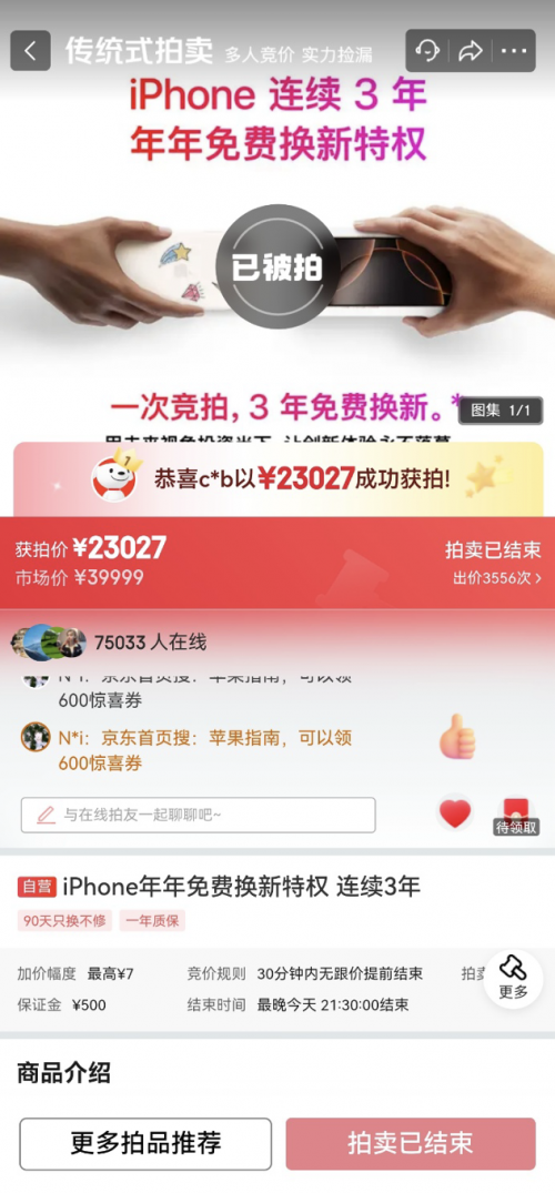 连续3年iPhone年年免费换新特权藏品,吸引了超7万果粉围观。拥有此特权,连续3年内每年都可以享受一次iPhone免费换新服务,堪称果粉梦寐以求的“终极售后礼包”。竞价从1元起拍价开始,在1个多小时内经历3556次激烈交锋,最终以23027元的价格被成功拍出。