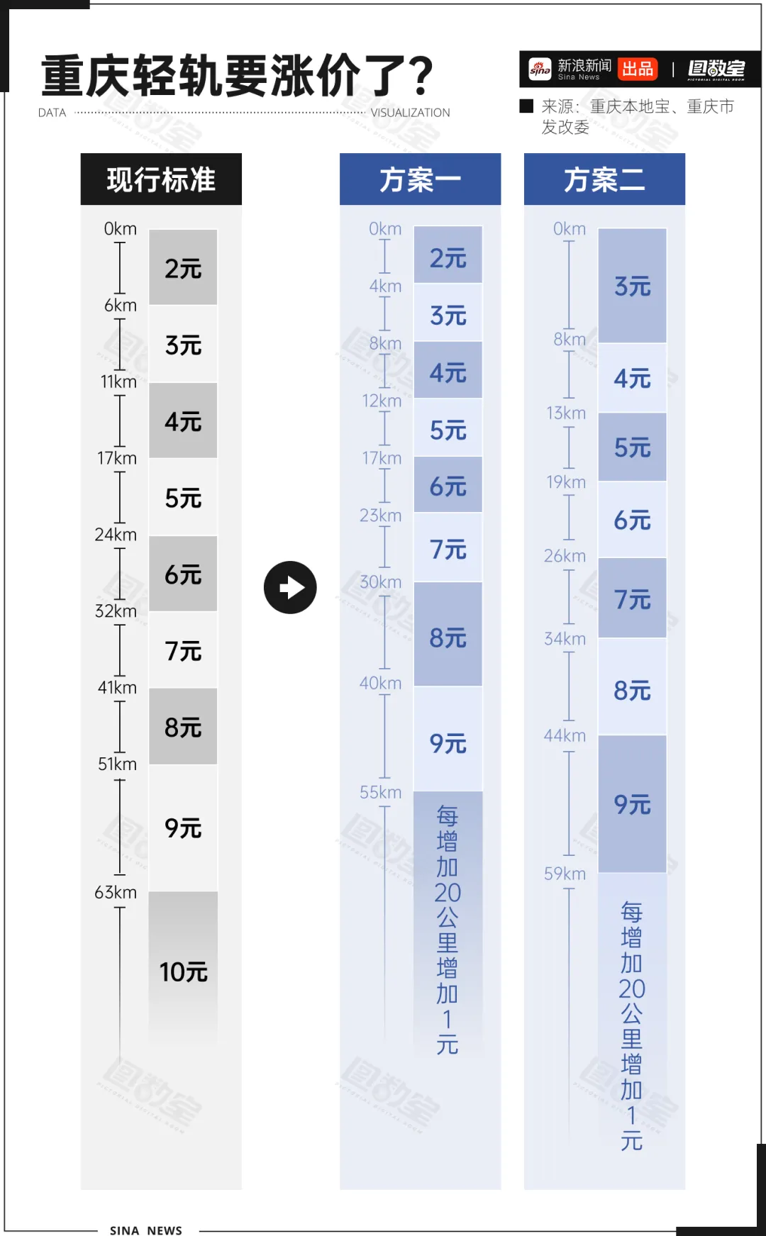 此次票价调整一共有两种方案,一是缩短起步里程,以前2元钱可以坐6公里轨道,现在只能坐4公里了;二是提高起步价,0-8公里(包含)的范围,票价均为3元。目前重庆城市轨道交通线网最长单程计费里程为88公里,方案一及方案二对应的票价均为11元。