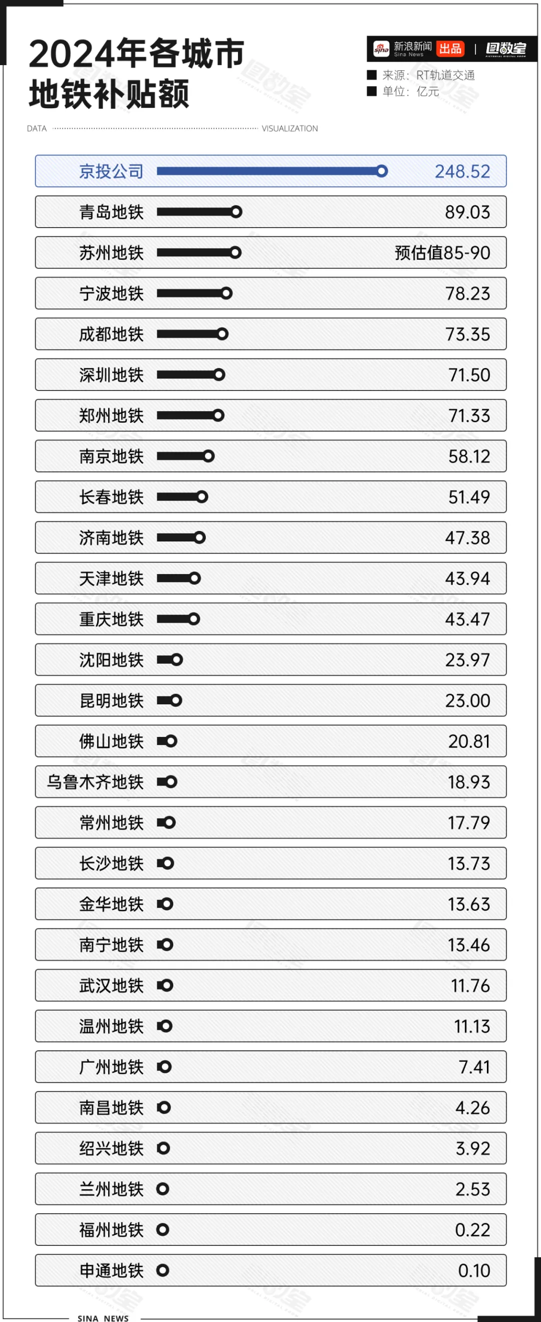 2024年,有28个城市获得了补贴,其中京投公司补贴位列全国第一,为248.52亿元。郑州、深圳、成都、宁波、苏州、青岛获得的补贴也在70亿元以上。