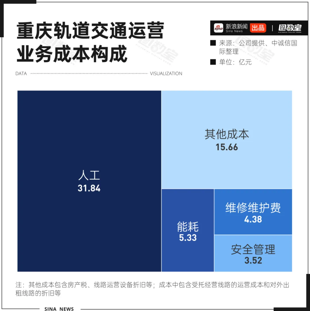 地铁的建设成本非常高,少则5-6亿元/公里,多则超过10亿元,日常运营成本也不低。《重庆市轨道交通(集团)有限公司2023年度跟踪评级报告》指出,重庆轨道交通运营成本仍主要由人工、能耗、维修维护费和安全管理等相关类别支出构成,其中人工成本占比最高,为31.84亿元,在60.73亿的总成本中占比超五成。