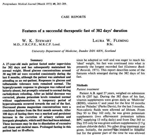 最终,在1966年7月1日,安格斯结束了禁食,整个禁食治疗足足持续了382天,而安格斯的体重成功减掉了250斤,达到他认为的理想体重164斤。