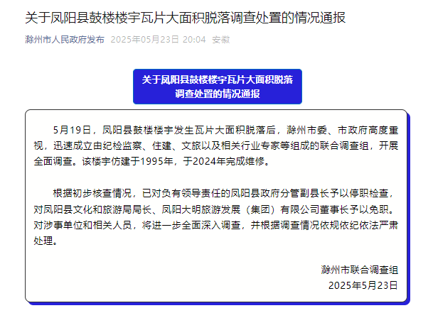 新京报讯 5月23日晚,滁州市人民政府发布关于凤阳县鼓楼楼宇瓦片大面积脱落调查处置的情况通报,详情如下: