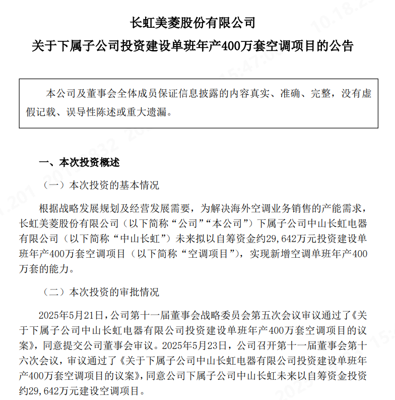 5月24日,长虹美菱发布公告,公司下属子公司中山长虹拟以自筹资金约2.96亿元投资建设单班年产400万套空调项目,以满足海外空调业务销售的产能需求。