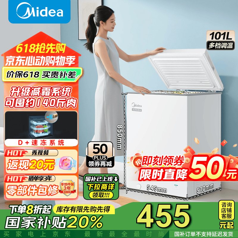 美的101L家用冰柜大容量节能省电395元限时特惠