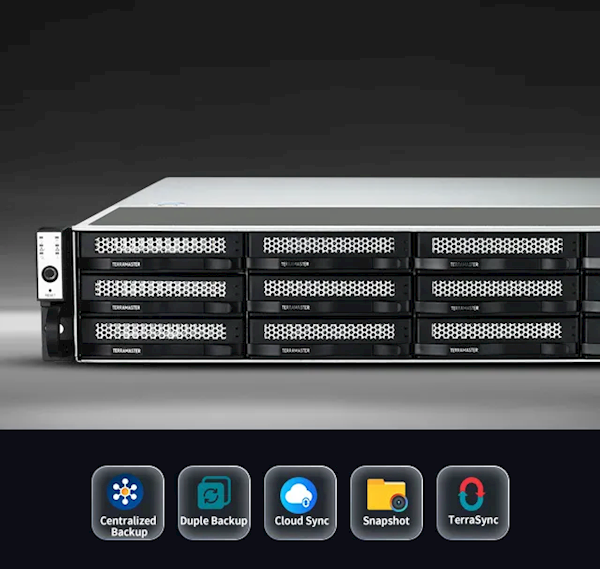 系统方面,使用TOS6系统专业操作系统,包含铁威马自主研发的—BBS 全场景备份解决方案,用户可依据自身业务特点,灵活运用:中央备份、双重备份、Terrasync 等功能,灵活部署存储备份策略。