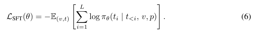 基于语言的监督微调(SFT)。在该对比方法中,规划任务被构建于语言模态中。与生成图像形式的中间状态不同,模型需生成动作序列的文本描述。形式上,给定输入视觉状态 v 及任务描述文本提示 p,模型被训练以输出一个动作序列 t = (t₁, ..., t_L),其中每个 token tᵢ ∈ V_text 表示一个动作。模型输入为提示词 token 与视觉 token 的拼接,目标为对应的文字动作序列。研究团队采用此前在自回归模型中常用的监督微调方法,通过最小化交叉熵损失来学习动作预测: