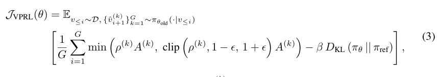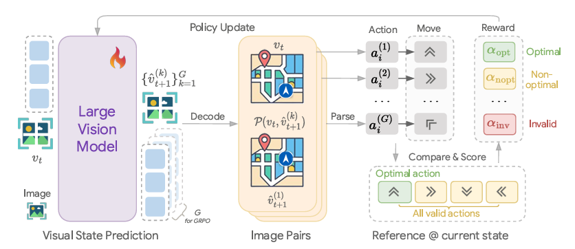 具体而言,给定当前输入前缀 v≤ᵢ,旧版本模型 π_θ^old 会采样出 G 个候选中间状态 {ˆvᵢ₊₁^(1), ..., ˆvᵢ₊₁^(G)}。每个候选状态代表了时间步 i 上智能体采取某一行动 a^(k) 后,模拟产生的下一视觉状态。研究团队使用基于规则的解析函数将状态对 (vᵢ, ˆvᵢ₊₁^(k)) 映射为离散动作,以便进行结构化解释。