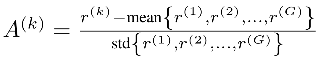 不同于传统强化学习中依赖学习一个价值函数评估器(critic),GRPO 通过候选组内的相对比较来计算优势值,从而提供易于解释、计算更加高效的训练信号。此时每个候选的相对优势 A^(k) 的计算方式为: