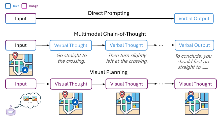 基于此动因,研究团队提出了一种全新的推理与规划范式 —— 视觉规划(Visual Planning)。该范式完全基于视觉表示进行规划,完全独立于文本模态。