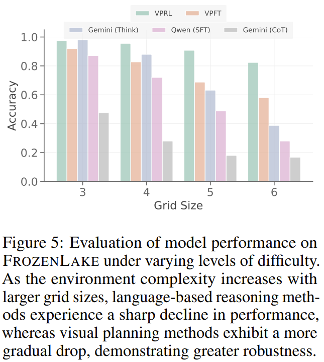 如图 5 所示,当在 FROZENLAKE 环境中,随着网格尺寸从 3×3 增加到 6×6,Gemini 2.5 Pro 的 EM 分数从 98.0% 骤降至了 38.8%。相比之下,新提出的视觉规划器不仅在所有网格尺寸下都保持了更高的准确度,而且性能曲线也更加平坦。同样,VPRL 也表现得比 VPFT 更稳定,在 3×3 网格上 EM 分数保持在 97.6%,在 6×6 网格上也仍能达到 82.4%,这表明 VPRL 的稳健性相当好。