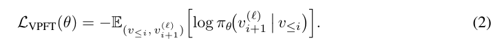 Stage 1:策略初始化。在该阶段,研究团队采用监督学习,通过在环境中的随机游走(random walk)生成的轨迹来初始化视觉生成模型 π_θ。目标是生成有效的视觉状态序列,并在「模拟」环境中保持充足的探索性。在训练过程中,每条轨迹由一个视觉状态序列 (v₀, ..., vₙ) 构成。对每条轨迹而言,研究团队提取 n−1 对图像样本 (v≤ᵢ, vᵢ₊₁),其中 v≤ᵢ 表示前缀序列 (v₀, ..., vᵢ)。随后,在给定输入前缀的情况下,模型会接触到来自 K 条有效轨迹的下一状态候选集 {vᵢ₊₁^(j)}_{j=1}^K。这些候选状态共享相同的前缀,为防止模型过拟合某一特定转换,同时鼓励生成过程的随机性,研究团队在每个训练步骤中随机采样一个候选状态 vᵢ₊₁^(ℓ) 作为监督目标,通过最小化视觉微调损失函数(VPFT)来优化模型: