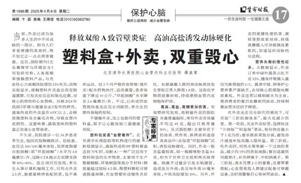 另据2024 年我国《环境与健康杂志》发布的研究,盛装热食的外卖盒在65℃以上,会释放微塑料及全氟化合物,导致血管内皮损伤。这意味着,盛装美味的塑料盒正加速心血管衰老。