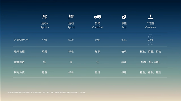 动力及续航上,车辆乘坐三个成年人,零百加速4.0秒。同时,新车提供运动+、运动、舒适、节能、个性化等多个驾驶模式,不同模式的动力、悬架软硬、转向力度也各不相同,充分满足各类人群的个性化需求。