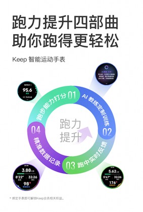 伴随AI跑步私教功能的推出,打造了完整的跑力提升闭环体验:从跑步能力打分到AI教练定制训练,再到跑中心率灯指导、实时反馈,以及最后的数据效果追踪,堪称“跑力提升四部曲”——Keep智能运动手表这种智能化的全程监测与反馈机制,将专业跑步指导完美融入日常训练,为每位跑者带来科学的训练体验。