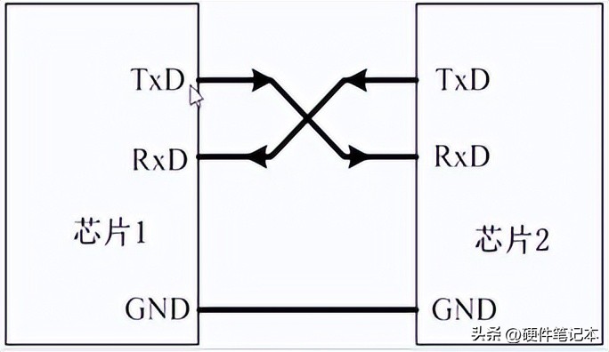 对于两芯片的间的连接,两个芯片GND共地,同时TXD和RXD交叉连接,这样两个芯片间可进行TTL电平通信。