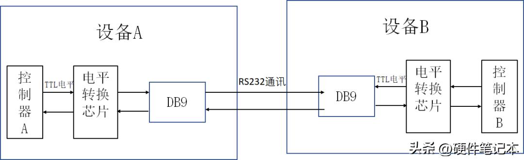 在上面的通讯方式中,两个通讯设备的"DB9接口"之间通过串口信号线建立起连接,串口信号线中使用"RS-232标准"传输数据信号。由于RS-232电平标准的信号不能直接被控制器直接识别,所以这些信号会经过一个"电平转换芯片"转换成控制器能识别的"TTL校准"的电平信号,才能实现通讯。