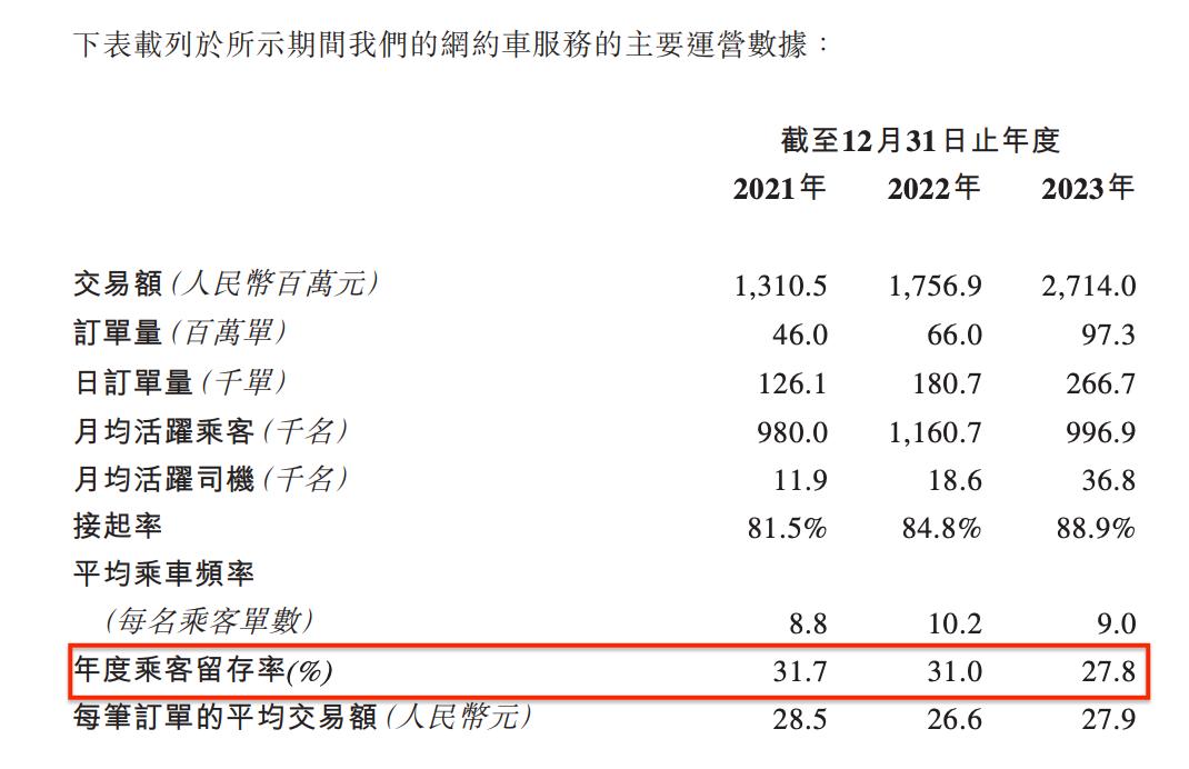 如祺在2024年财报中未披露佣金支出,不过,翻看其招股书能找到前几年的数据。其2021年-2023年的佣金支出(招股书称为第三方出行服务平台的服务成本)分别为691万、2669万、9551万元,占其网约车服务收入的比例涨到了5.3%。这期间,如祺的佣金支出增长了12倍,网约车服务收入增速80%。三个平台中,对高德依赖性最强的是盛威时代,其聚合平台费用占营收的比例也最高,过去几年稳定在9%。上述从业者表示,如果聚合平台提高抽佣比例或政策调整,这些平台的盈利模型可能会面临直接冲击,估值也有滑坡风险。长远来看,比佣金抽成更要命的,是用户“用完就走”:二线网约车平台既攒不下回头客,也拿不到用户核心数据。如祺出行在招股书中明确提到,因为第三方聚合平台的订单量不断增加,网约车服务的月活用户从2022年的116万,下滑到2023年的99.7万,用户留存率跌破28%。