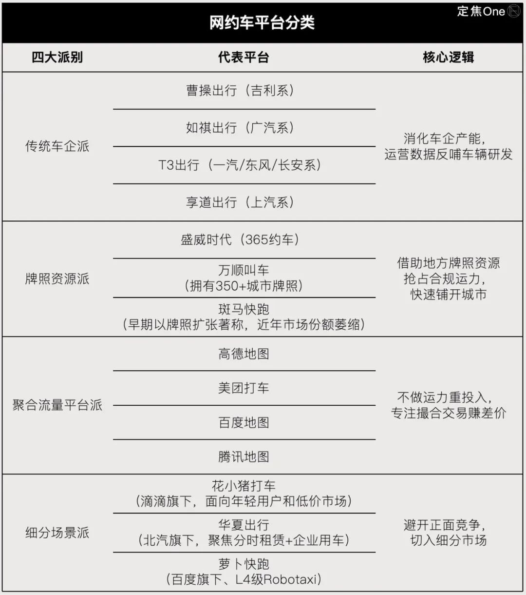 一面是二线平台扎堆IPO:4月30日,曹操出行向港交所更新了招股书,4月18日,它刚拿到中国证监会的海外上市通行证;5月9日,上汽集团旗下享道出行宣布完成13亿元C轮融资,创下近三年行业最大单笔融资纪录。享道出行表示,已启动港股IPO计划,将借此轮融资加速IPO进程。另一面是市场饱和与盈利困局:5月13日,盛威时代(旗下网约车平台365约车)港股IPO招股书失效。业内分析,或是因其持续亏损、监管处罚,以及订单高度依赖高德流量。广汽系如祺出行的亏损表现和Robotaxi商业化进展缓慢,让它的市值从上市之初的80亿港元跌至目前的23亿港元。网约车平台上市潮背后,是中国网约车市场“金字塔型”的竞争生态:滴滴处于第一梯队(市场份额70%以上),后方玩家分化出四个派别。