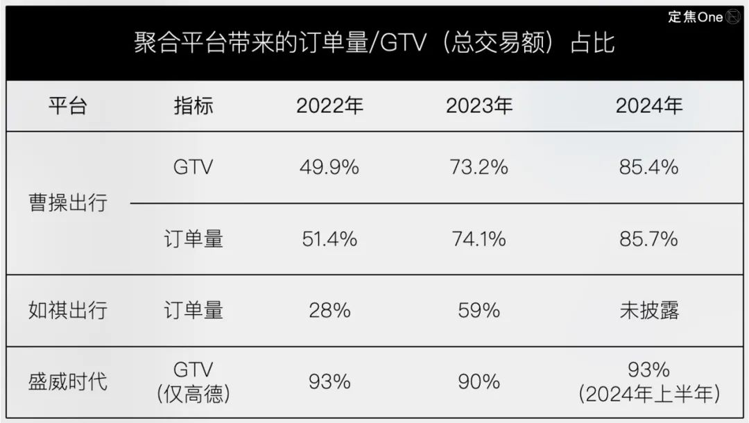 聚合模式彻底改变了网约车行业的竞争规则。曹操出行招股书提到,2019年,聚合平台仅掌控7%的订单分发权;到2024年,这个比例已经升到31%。五年间超三倍的增长,反映了用户习惯的转变:越来越多用户习惯通过一个软件(如地图软件)一键全网叫车,等待系统自动派发最便宜或最快接单的车辆。这也导致行业整体结构的变化,流量加速向超级入口集中,曹操出行、T3出行等平台正是抓住这波红利,借聚合平台实现订单量爆发。网约车行业从业者李立表示,聚合平台早期以重营销、高补贴换取规模增长,随着用户对性价比的需求越来越高,聚合平台的订单量比例还有上升空间,而已上市或正在冲刺IPO的二线网约车对聚合的依赖性只增不减。需要补充的是,在四大聚合平台(高德、百度、美团、腾讯)之外,滴滴也向曹操出行开放了流量池,将其纳入聚合体系。李立分析,滴滴此举既能通过流量分发赚取佣金,又可缓解早晚高峰的运力压力;曹操也可借助滴滴流量,对冲对高德、美团等第三方平台的过度依赖。有细心的用户发现,使用滴滴APP打车时,有些长距离订单的曹操出行显示的价格甚至会略低于自营快车。盈利难:佣金上涨影响利润网约车行业常被贴上“规模经济”的标签:技术平台搭建完成后,每新增一单的服务器、算法等边际成本递减,同时网络效应增强,更多司机吸引更多乘客,更高订单密度提升匹配效率,降低空驶率。但是,当滴滴和高德占据着七成以上的出行流量入口,网约车平台依附于聚合生态,曹操们作为互联网平台的网络效应就被大大削弱。当议价权逐渐向聚合平台倾斜,网约车平台为了维持订单量,就需让渡更多包括佣金、数据和品牌等在内的核心权益。一位前网约车从业者对‘定焦One’解释,聚合模式的流量分配机制是优先低价或高响应运力。长此以往,司机培训、车辆维护等需要长期投入的核心竞争力逐渐被弱化,竞争就简化成了价格(佣金、如何压缩成本)和响应速度(运力密度)。这套模式自然削弱了二线平台的品牌认知度,用户难以形成忠诚度。目前公布财务数据的曹操、如祺和盛威时代都未盈利,一个共同原因在于:这些平台虽然靠聚合平台拿到了更多订单,但佣金越交越多,用户却是“用完就走”——既没攒下利润,也没留住用户。
