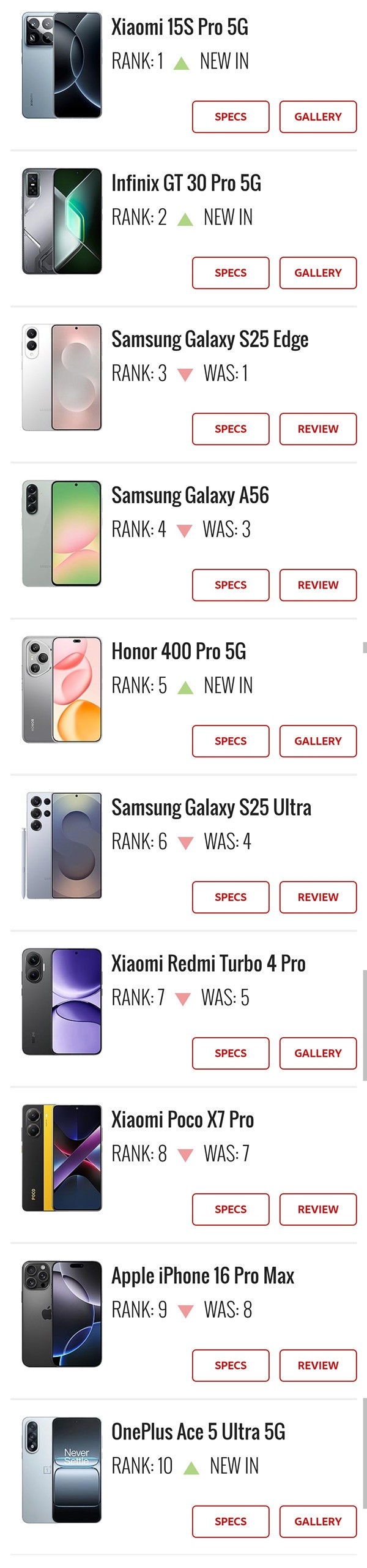 排名第一的是刚刚发布的小米15S Pro,这款搭载小米自研玄戒O1芯片的旗舰机型凭借强劲性能和创新卖点迅速吸引了大量关注。