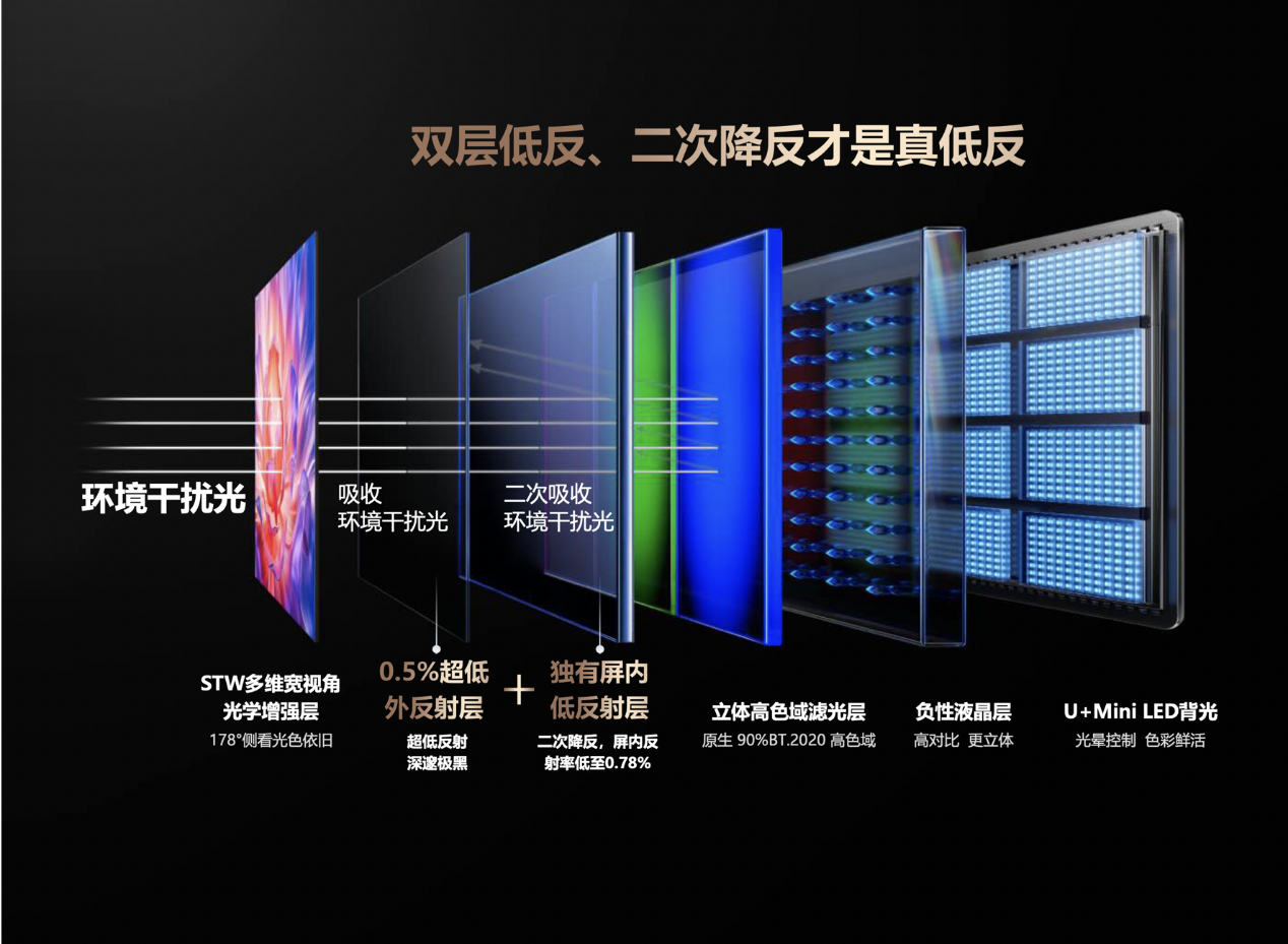 作为双方联名周边的“主角”,海信影游旗舰电视E8Q Pro简直是为《黑神话:悟空》量身定制的“通关神器”。特别是被主机玩家们吹爆的黑曜屏Ultra,它做到了行业里独一份的内外双层纳米级LR低反膜,加上矩阵式设计的多层偏光片,直接做到了行业最低的1.28%反射率,黑度是普通屏幕的四倍!不管你是在阳光灿烂的午后刷BOSS,还是晚上开着灯挑战高难度关卡,屏幕再也不会变成“反光镜”,黑猴的每个招式细节都看得明明白白。而且这屏幕视角超广,就算五六个好友挤在沙发上围观,斜着坐也能看清游戏画面,再也不用为了抢“C位”打起来了!