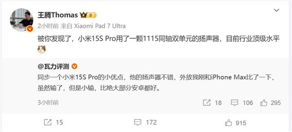 快科技5月26日消息,REDMI总经理王腾介绍,小米15S Pro配备一颗1115同轴双单元扬声器,是目前行业内的顶级水平。