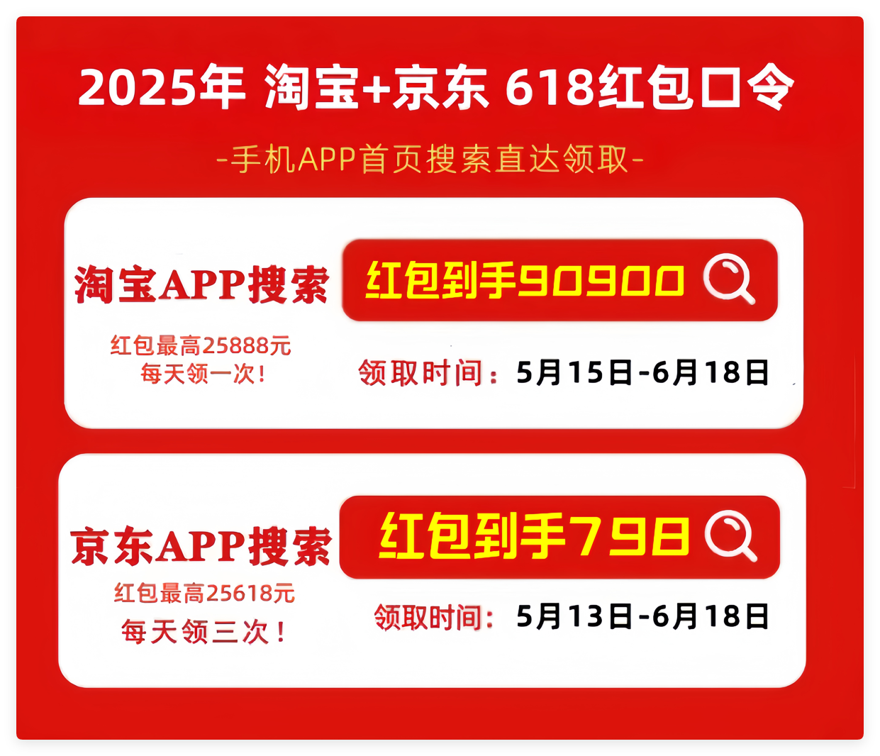 首先,划重点!2025年最新的京东618红包口令是「红包到手798」,天猫/淘宝618红包口令是「红包到手90900」记得每天去领,领的红包大小和你搜索的什么口令有关的!