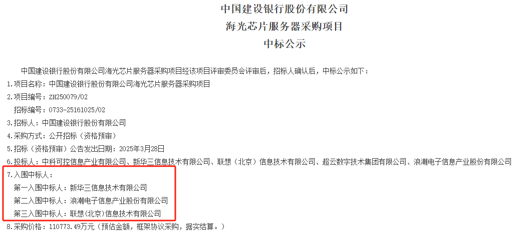 此次,中国建设银行公布的中标结果涉及到鲲鹏芯片服务器、海光芯片服务器两大类。其中,鲲鹏芯片服务器项目的采购价格为337142.24万元,海光芯片服务器项目的采购价格为110773.49万元(均为预估金额,按框架协议采购,据实结算),总金额超过44亿元。