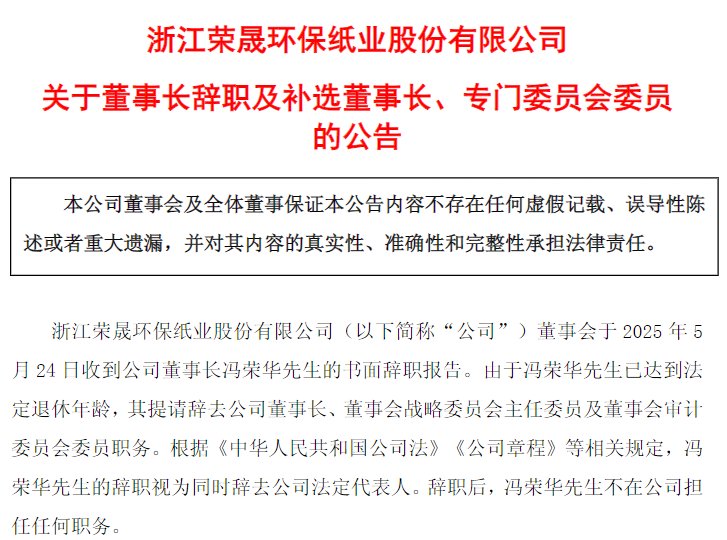 来源:公告,下同同时,荣晟环保还公告,董事会已于5月24日收到公司冯荣华的书面辞职报告。由于冯荣华已达到法定退休年龄,其提请辞去公司董事长、董事会战略委员会主任委员及董事会审计委员会委员职务。辞职后,冯荣华不在公司担任任何职务。