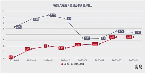 吉利“星愿”去年年底上市之后,凭借接近比亚迪“海豚”的空间和接近比亚迪“海鸥”的售价,直接在A0级市场杀出了一条“血路”。“海鸥”加“海豚”的销量从今年1月锐减至今,始终只能在4万辆每个月上下徘徊,而“星愿”一款的销量却已经开始逼近4万辆每个月。