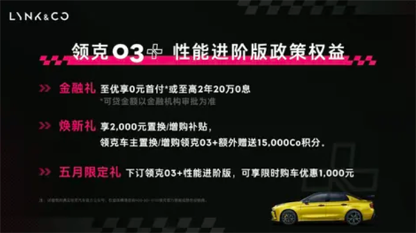 新车基于现款领克03+打造,动力系统升级为2.0T双增压发动机,最大功率达到309马力,提供了更强劲的动力输出。