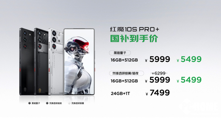 红魔10S Pro+黑暗量子16+512GB售价5999元,国补后5499元;氘锋透明银翼/暗夜16+512GB售价6299元,首发价5999元,国补后5499元;24+1TB售价7499元。红魔10S Pro鸣潮联名限定版16+512GB,售价5999元,国补后5499元即可拥有。