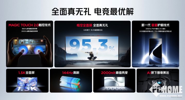 作为屏下技术的领航者,红魔在屏下技术上已经迭代到第七代。红魔10S Pro系列搭配6.85英寸、屏占比高达95.3%的悟空全面屏,做到全面真无孔,带给用户极具冲击的视觉体验。屏幕的1.5K分辨率、2000nit峰值亮度与144Hz自适应高刷组成视效黄金三角。极窄1.25mm黑边让游戏体验更胜一筹。
