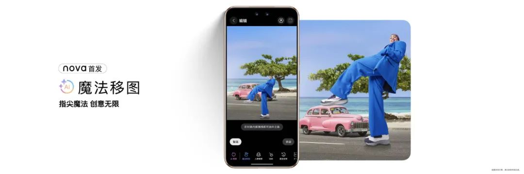 同时,在nova 14系列上,AI还在全面深入年轻人群使用手机的每一个场景。比如在修图方面,这次,鸿蒙5在nova 14系列上首发了一个「AI魔法移图」的功能,为社交媒体时代的数字创作提供了更多的新鲜玩法。