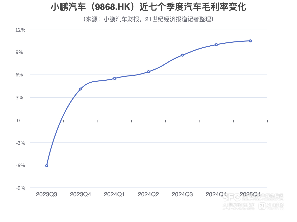 从历次披露的汽车毛利率数据来看,小鹏汽车已经连续七个月实现了整车利润率的提升。今年一季度,小鹏汽车的汽车毛利率已经达到10.5%,同比增长了5个百分点,环比增长0.5个百分点。