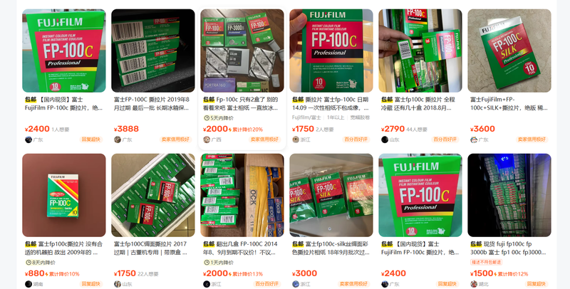 即便如此,年轻人的热情依旧高涨,这一点从二手市场就能窥见一角。富士FP-100C停产多年,存货价格像坐了火箭,根据生产日期、批次差异,闲鱼上一盒未拆封的富士FP-100C普遍标价在1500-4000元之间(停产前70元),折合单张最低150元,至少是相纸停产前售价的20倍,比茅台还贵。