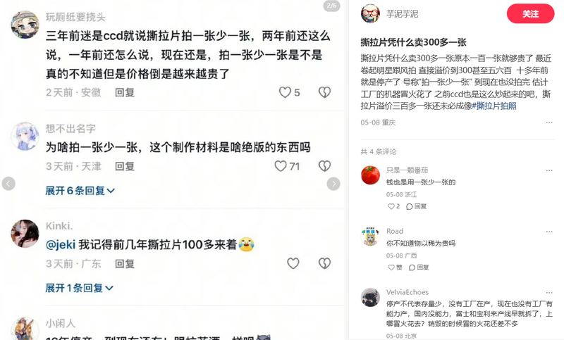 乐观点的小鱼说这是长期趋势,“黑胶唱片死了十几年年,现在不也复兴了?只要有人愿意为体验买单,撕拉片就不会消失。”她特别提到,现在撕拉片玩家中出现了明显的“分层现象”:“普通用户玩社交传播,硬核玩家在研究显影技术,收藏家在囤相纸,这种生态反而比单一市场更健康。”