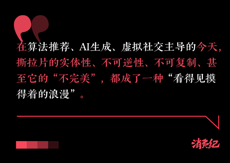 但当我们抛开营销滤镜,撕拉片的真正意义或许并不在于它的稀缺性,而在于它提供了一种对抗数字时代的方式——哪怕只是象征性的。在算法推荐、AI生成、虚拟社交主导的今天,撕拉片的实体性、不可逆性、不可复制、甚至它的“不完美”,都成了一种“看得见摸得着的浪漫”。
