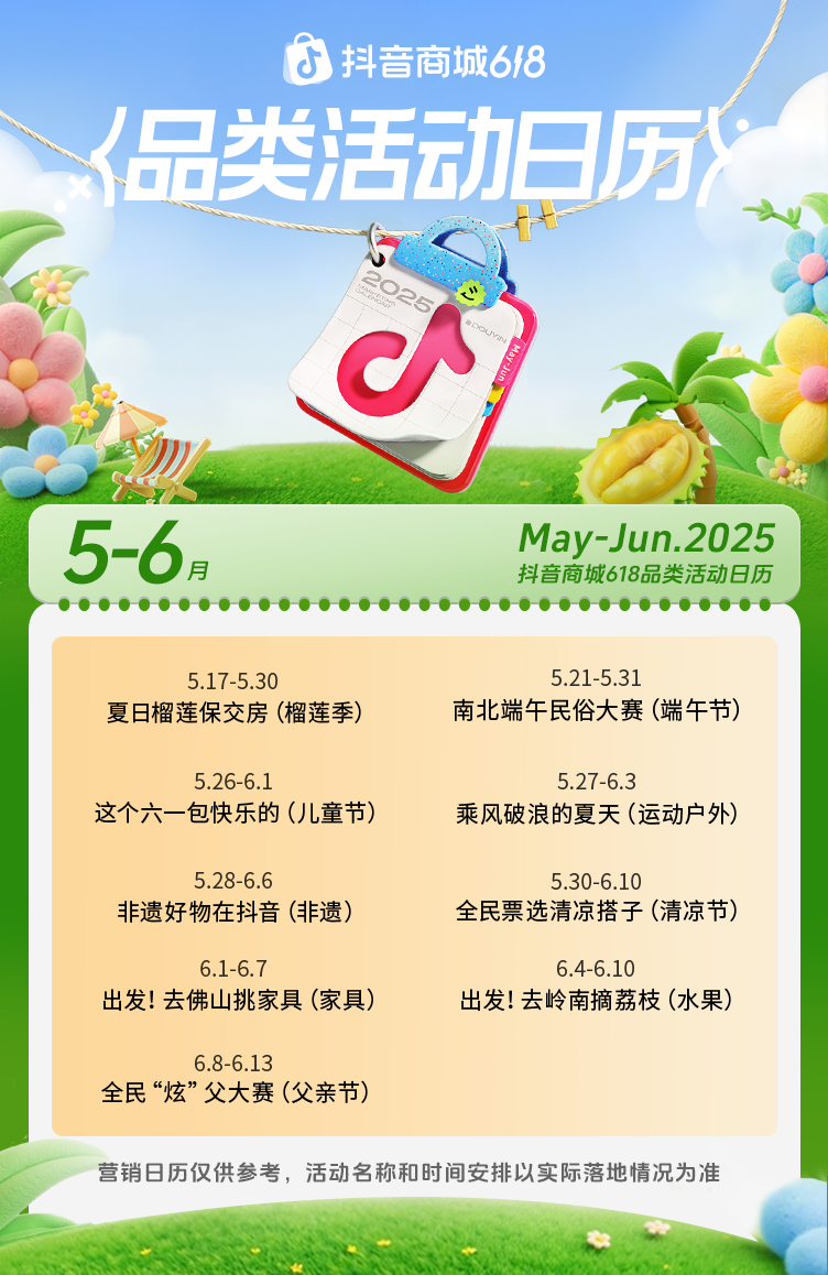 在抖音电商官方公布的特色品类日活动日历中,节日节点、当季时令、热点主题与原产地溯源成为几大核心策划维度。除了已经上线的端午节“南北民俗大赛”、榴莲季“榴莲保交房”外,还有即将上线的父亲节“首届炫‘父’大赛”、儿童节“这个六一包快乐的”、户外季“乘风破浪的夏天”、清凉周“清凉搭子投票”、非遗主题活动“非遗好物在抖音”,以及“去岭南摘荔枝”等品类日活动。