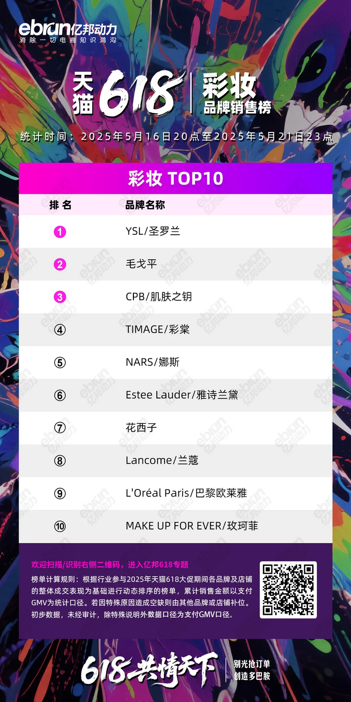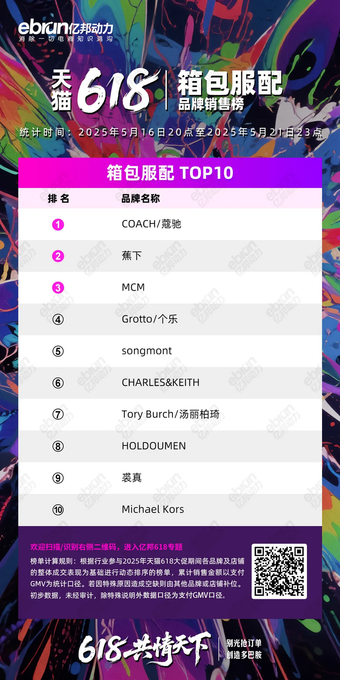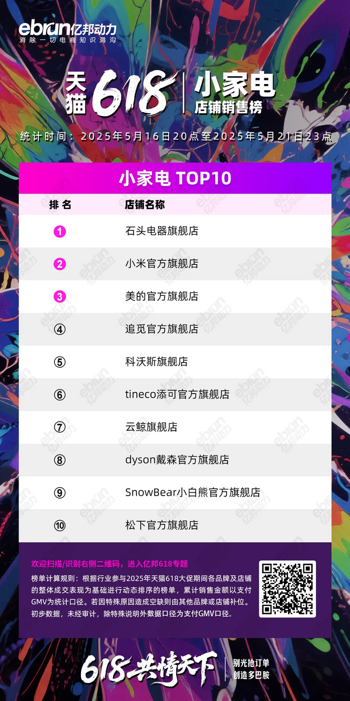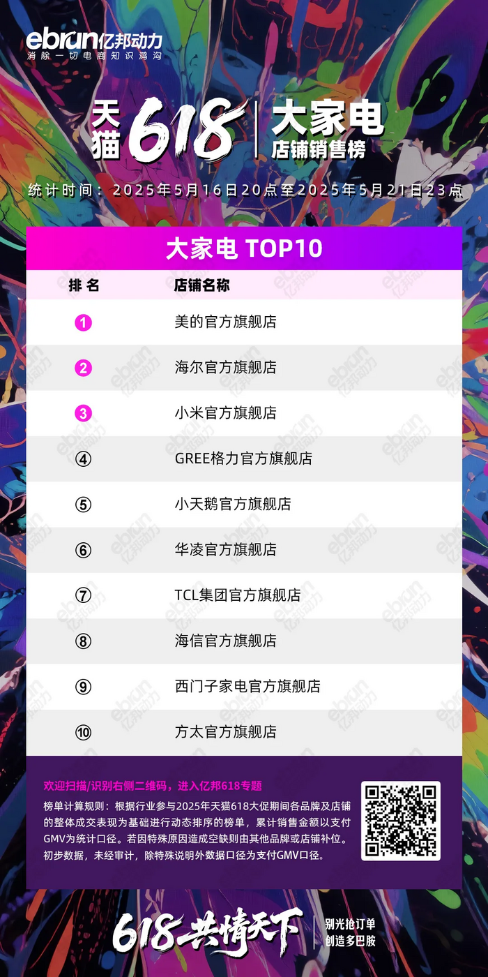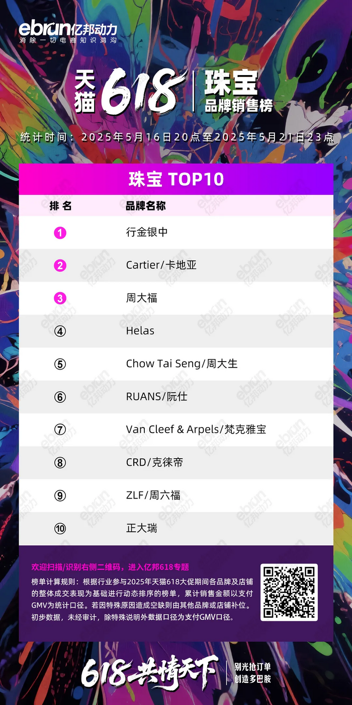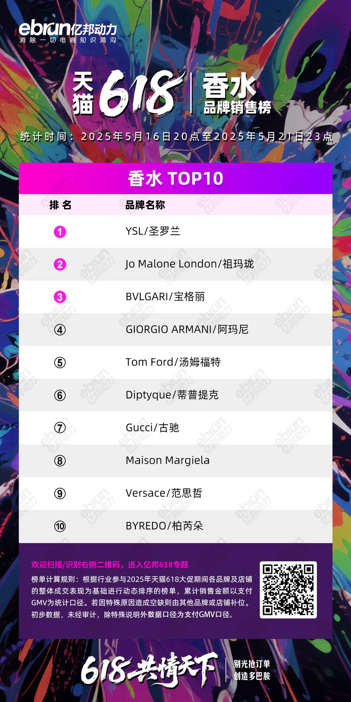 根据行业参与2025年天猫618大促期间各品牌及店铺的整体成交表现为基础进行动态排序的榜单,累计销售金额以支付GMV为统计口径。若因特殊原因造成空缺则由其他品牌或店铺补位。初步数据,未经审计,除特殊说明外数据口径为支付GMV口径。
