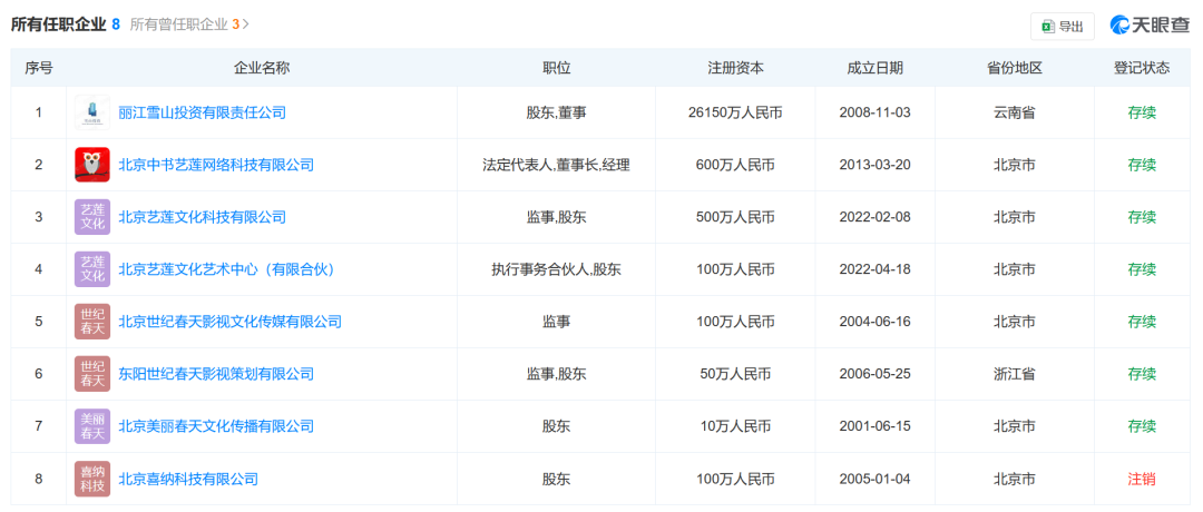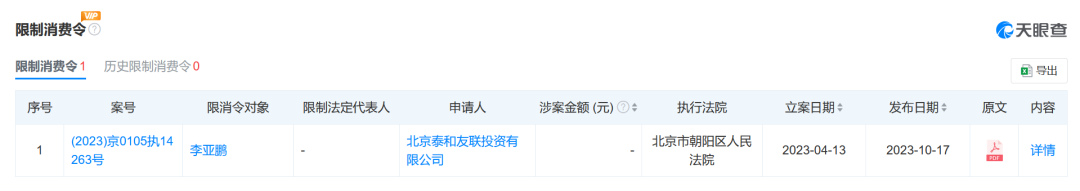 天眼查App显示,李亚鹏名下关联8家企业,其中7家为存续状态,包括丽江雪山投资有限责任公司、北京中书艺莲网络科技有限公司、东阳世纪春天影视策划有限公司等。除上述公司外,李亚鹏还担任北京市朝阳区嫣然天使儿童医院法定代表人。天眼风险信息显示,目前,李亚鹏已于2023年10月被北京市朝阳区人民法院限制高消费。